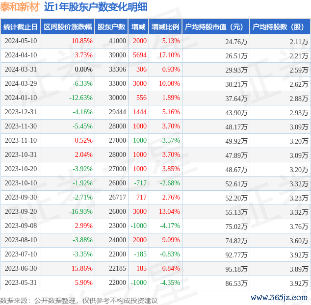 从股价来看,2024年4月30日至2024年5月10日,泰和新材区间涨幅为10.85%,在此期间股东户数增加2000.0户,增幅为5.13%。