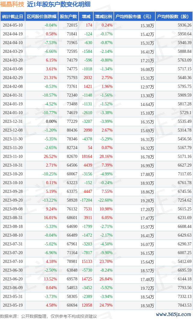从股价来看,2024年4月19日至2024年5月10日,福晶科技区间跌幅为0.04%,在此期间股东户数增加174.0户,增幅为0.24%。