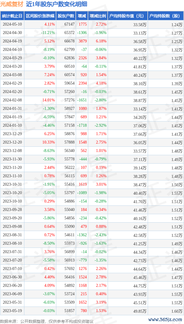 从股价来看,2024年4月30日至2024年5月10日,光威复材区间涨幅为4.11%,在此期间股东户数增加1775.0户,增幅为2.72%。