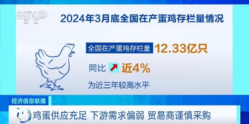 业内人士指出,鸡蛋的供应相比往年有所增加,数据显示,截至2024年3月底,全国在产蛋鸡存栏量达12.33亿只,同比增幅接近4%,为近三年较高水平。而目前鸡蛋处于需求淡季,下游贸易商以及食品企业因谨慎而不敢囤货,导致需求表现偏弱。