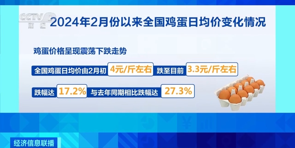 据了解,今年2月份以来,鸡蛋价格呈现震荡下跌的走势,全国鸡蛋日均价由2月初的4元/斤左右,跌至目前的3.3元/斤,跌幅达到17.2%,而与去年同期相比,跌幅更加达到27.3%。
